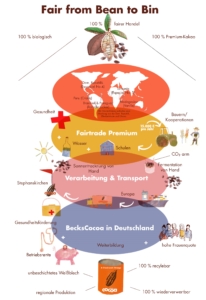 Bean-To-Bar bedeutet bei Schokolade, dass von der Bohne bis zur Tafel alles vom Chocolatier selbst verarbeitet wurde, das schmeckt meist ausgezeichnet. Wir bei BecksCocoa sind keine Schokoladenhersteller und bei der Kakao-Produktion auch auf Zwischenstationen angewiesen. Aber eines können wir garantieren: Unser Kakao ist „from bean to bin“ fair – von der Bohne bis zur umweltfreundlichen Dose.